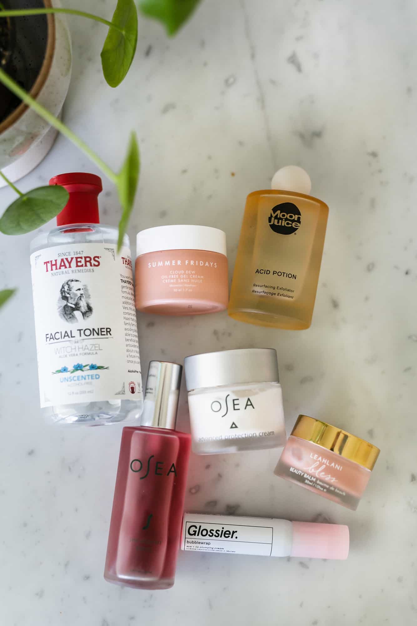 Left: Thayers Toner / Sea Vitamin Boost / Sour drink / Bless balm / Clouds of dew / Atmospheric protection cream / Vagus nerve pad fog / Lip sleeping mask / Honest gel cleanser