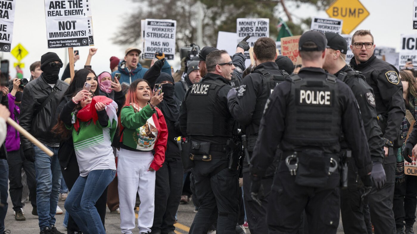 Demonstrators record Seattle police officers during a march against Immigration and Customs Enforcement (ICE) in Seattle on Feb. 8, 2025. Bystander videos have become central to public understanding of many news events.