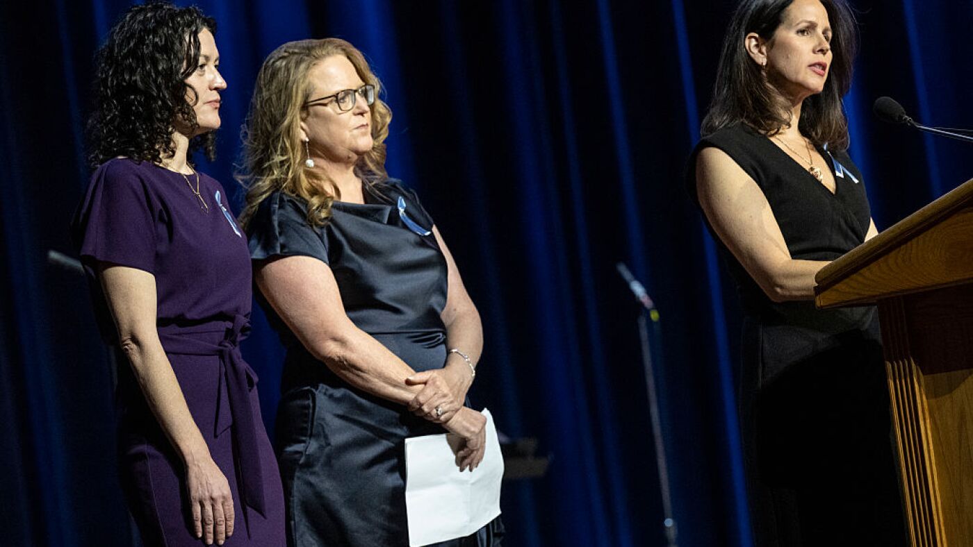 Rachel Feres (left) and other family members speak at a memorial event at DAR Constitution Hall in Washington, D.C. for the 67 people who were killed in the midair collision of a U.S. Army helicopter and an American Airlines regional jet a year ago.