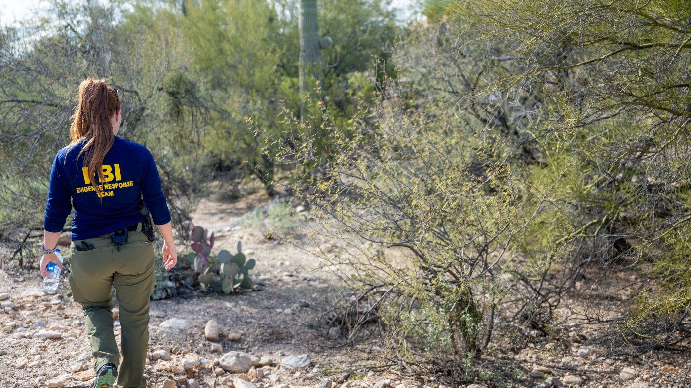 A member of the FBI’s Evidence Response Ream searches an area around Nancy Guthrie’s residence in Tucson, Ariz., on Feb. 11. Police say that DNA samples have been recovered in and around Guthrie’s home and that investigators are considering “additional investigative genetic genealogy options.”