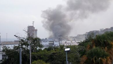 Law enforcement officers look out from a United States Immigration and Customs Enforcement (ICE) facility Oct. 21, 2025, in Portland, Ore.