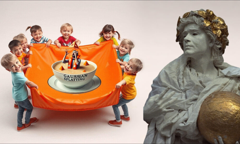 Elke platte Gaussiaans wordt weergegeven als drie punten in een wolk van driehoeken, ‘driehoekensoep’ genoemd, waardoor het afgeleide beeld openstaat voor manipulatie. Bron: https://arxiv.org/pdf/2410.01521