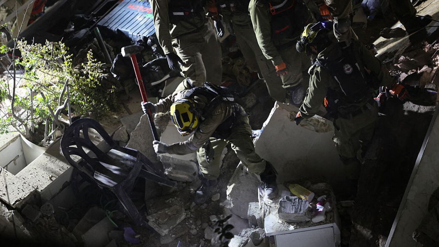 HAIFA, ISRAEL, – APRIL 5: Israeli emergency responders search for missing people at the site of an apparent Iranian ballistic missile strike on April 5, 2026 in Haifa, Israel.