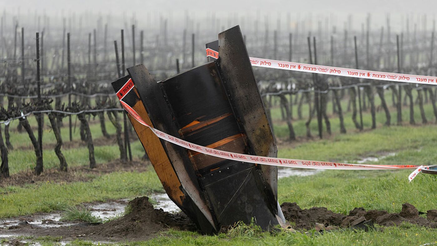 The tail section of a ballistic missile fired from Iran sticks out of the ground at a vineyard in the Israeli-controlled Golan Heights on March 20.