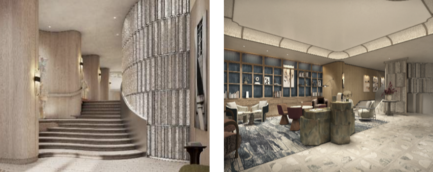 A curved stone staircase gently leads guests upstairs, transitioning from the mansion-like foyer to an intimate lobby lounge above. Alcoves carved along the ascent display commissioned works of art on sculptural plinths. Inspired by the cityscape, these works reflect the skyline and energy of Hong Kong and are reflected in carpet designs, tapestries and gilded glass mirrors in elevators and corridors.