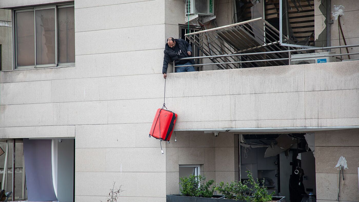 A man lowers a suitcase from the balcony of a building damaged by a US-Israeli strike on a commercial district on March 29, 2026 in Tehran, Iran.