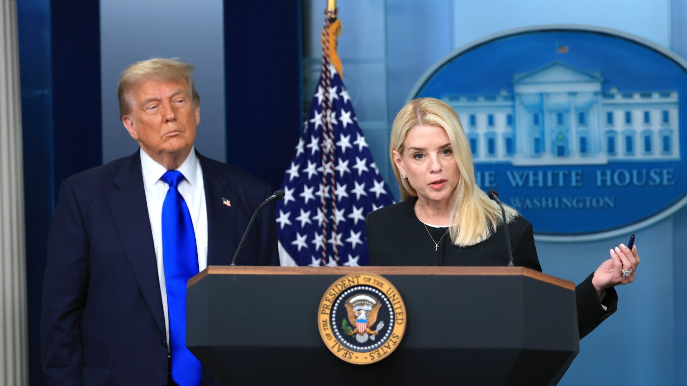 Attorney General Pam Bondi speaks alongside President Trump in the briefing room at the White House in June 2025 in Washington, D.C.