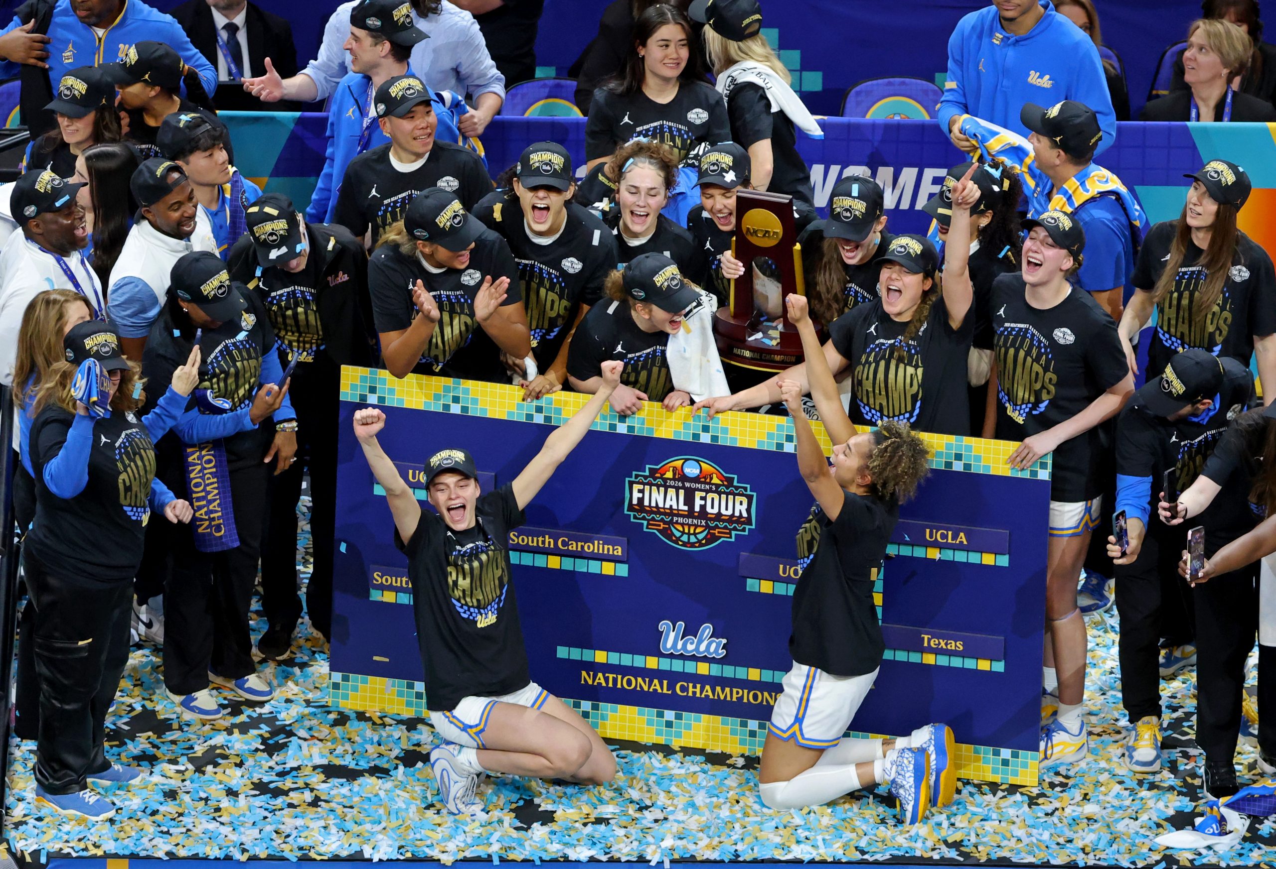 As the trio has done countless times this season, they delivered a performance similar to that of the UCLA dance team, but this final one felt special after defeating South Carolina 79-51 at Mortgage Matchup Center for the Bruins’ first NCAA championship.